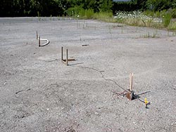 16. Juni 2004: Geräuschpunkt 6 Auf dem Gelände der ehemaligen Kabelwerke Rheydt sind 12 Haufen sichtbar, wo Wellen durch den Asphalt gebrochen sind. Diese liegen genau auf dem Meridian. Unklar ist, wann und woher die Ausbrüche stammen. |
