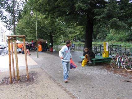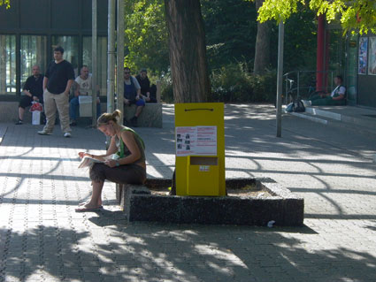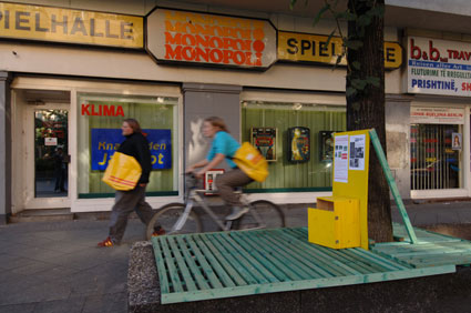 Johannisthaler Chausee mit Briefkasten (Bank wurde vom Wachschutz der Gropius Passagen entfernt)